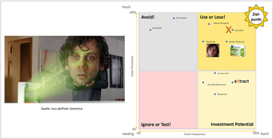 Bei der Vermarktung von OTC-Produkten entsteht ein wachsendes Problem, wenn die Marke selbst die Entscheidung beeinflussen muss. Um eine Wahl treffen zu können, ist die sogenannte „Mental Availability“ unerlässlich, sei es durch bisherige Erfahrungen oder durch kommunikative Reize, die klar auf ein bestimmtes Produkt hinweisen und Verwechslungen ausschließen. Solche einzigartigen Markenattribute erleichtern die mentale Entscheidungsfindung und sind essenziell dafür, dass wir uns auf unserem intuitiven System 1-Autopiloten verlassen können. Eine klare Dekodierung unterstützt die Zuordnung zu einer bestimmten Therapie und Marke und bietet im besten Fall spezifischen Nutzen unter bestimmten Bedingungen. Wie beispielsweise der freie Atemtrakt auf der GeloMyrtol-Packung. Oder die Möve als Key Visual für Balance und innere Ruhe bei Neurexan.Um die Wirkung von Markencodes aktuell einzuschätzen, ist die Erstellung eines Distinctive Asset Grid nützlich. Das Resultat kontinuierlicher Marktforschung visualisiert eine Art „Gedächtnisabdruck“ einer Marke, indem die mentale Wirkung einzelner Markenattribute erfasst, dokumentiert und getrackt wird. Starke Marken verfügen normalerweise über mehrere deutlich unterscheidbare Markenattribute, die die Basis für darauf aufbauendes Storytelling bilden.