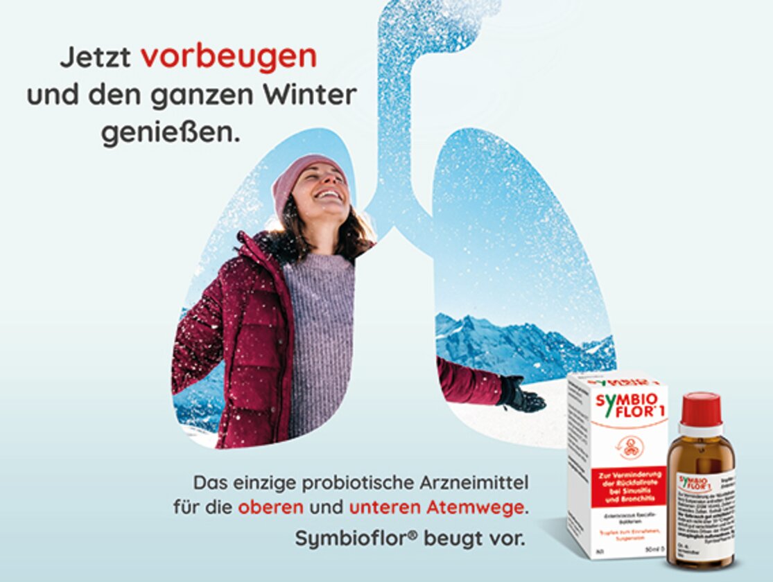 In der kalten Jahreszeit will man von wiederkehrender Sinusitis oder Bronchitis nichts hören. Vielmehr wolle man in vollen Atemzüge genießen genießen – den Winterurlaub, den Alltag, jeden einzelnen Tag der kalten Jahreszeit. Und das sei einfacher als gedacht: Vorbeugen sei das Zauberwort – denn Symbioflor® 1 mit dem natürlichen Darmbakterium Enterococcus faecalis sei das erste und einzige probiotische Arzneimittel, das die körpereigenen Abwehrkräfte stärkt und das Immunsystem trainiert.