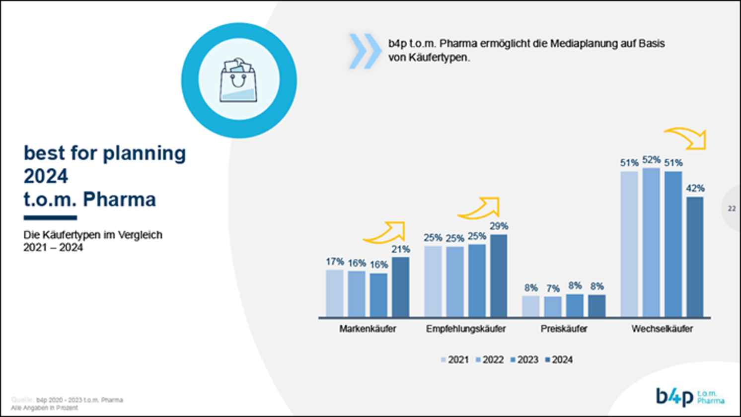 t.o.m. Pharma bietet eine fundierte Datenbasis für die Mediaplanung, unter anderem durch die Segmentierung der Käufergruppen in Marken-, Empfehlungs-, Preis- und Wechselkäufer. Während die preissensible Käuferschaft im Vergleich zum letzten Jahr gleichbleibend ist (8 %), verzeichnen die markenaffinen Käufer:innen sowie Käufer:innen, die auf Empfehlungen vertrauen, einen leichten Anstieg. Im Jahr 2023 haben 16 Prozent OTC-Produkte aufgrund einer bestimmten Marke gekauft, 2024 waren es bereits 21 Prozent. Fast ein Drittel der Befragten (29 %) kaufen 2024 ein Gesundheitsprodukt, weil es ihnen empfohlen wurde (+ 4 % ggü. Vorjahr).