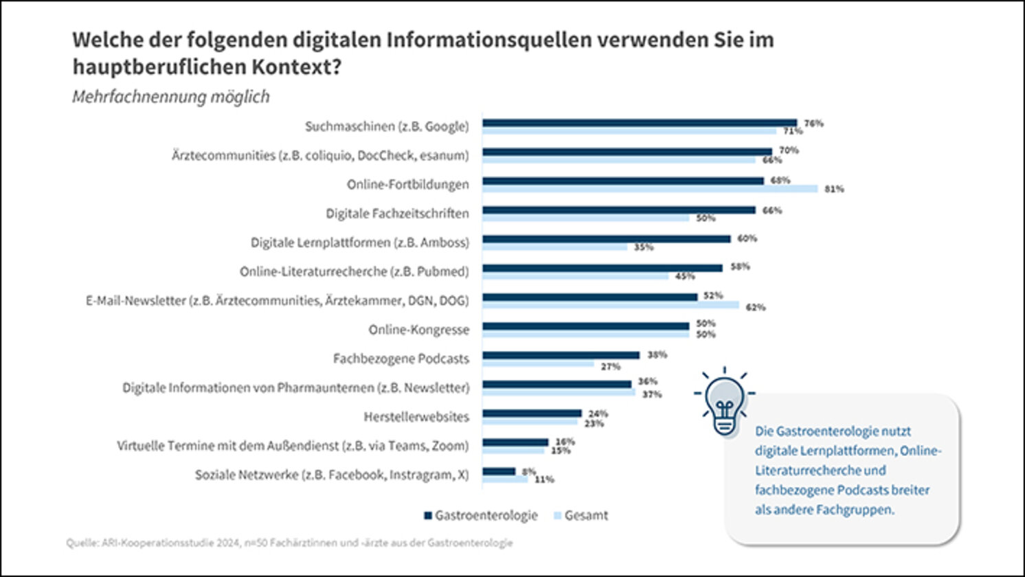 Der Großteil ihrer Recherche erfolgt digital – über Lernplattformen, Podcasts, Literaturdatenbanken und zunehmend mithilfe von KI-Tools wie ChatGPT. Dennoch bleiben klassische Medien wie Fachzeitschriften und Präsenzkongresse relevant und geschätzt (ARI-Studie 2024). Über die Hälfte nimmt mit drei- bis viermal im Jahr überdurchschnittlich häufig an Kongressen teil, wobei hybride Formate klar bevorzugt werden. Sie dienen nicht nur dem CME-Punkte-Erwerb, sondern auch dem persönlichen Austausch und der Bewertung neuer Therapieoptionen.