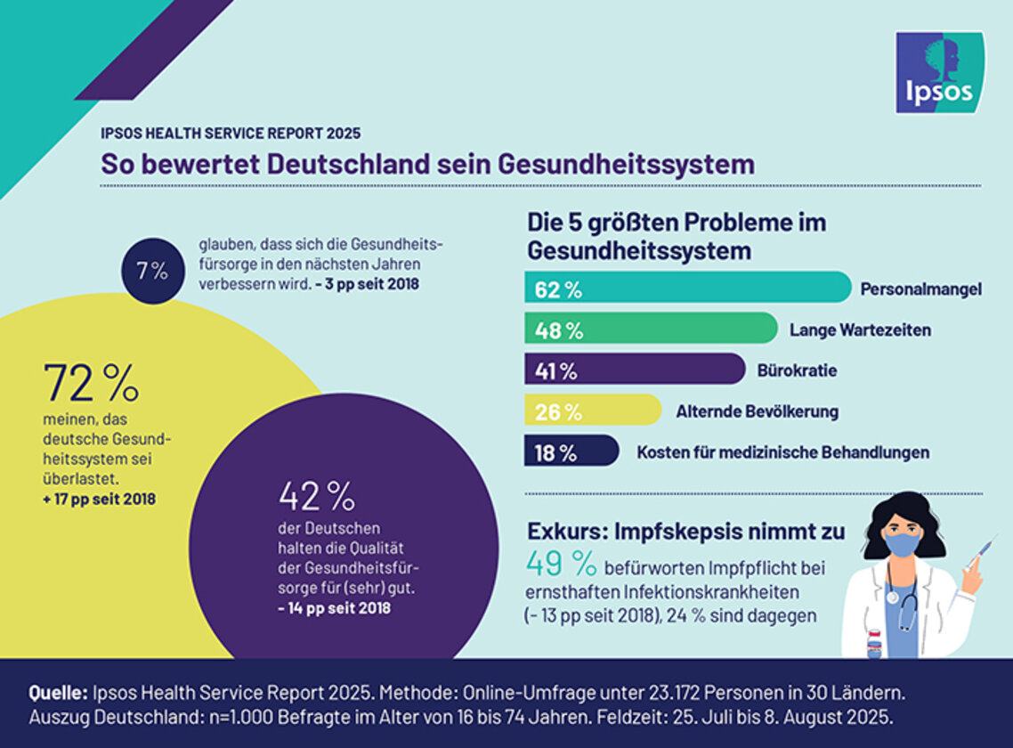 Diese und weitere Einstellungen und Wahrnehmungen der Menschen gegenüber ihrem Gesundheitssystem wurden im Ipsos Health Service Report 2025 in 30 Ländern weltweit untersucht. Die Studie wurde in diesem Jahr bereits zum siebten Mal durchgeführt und wirft ein Schlaglicht auf die zunehmenden Probleme im deutschen Gesundheitswesen.