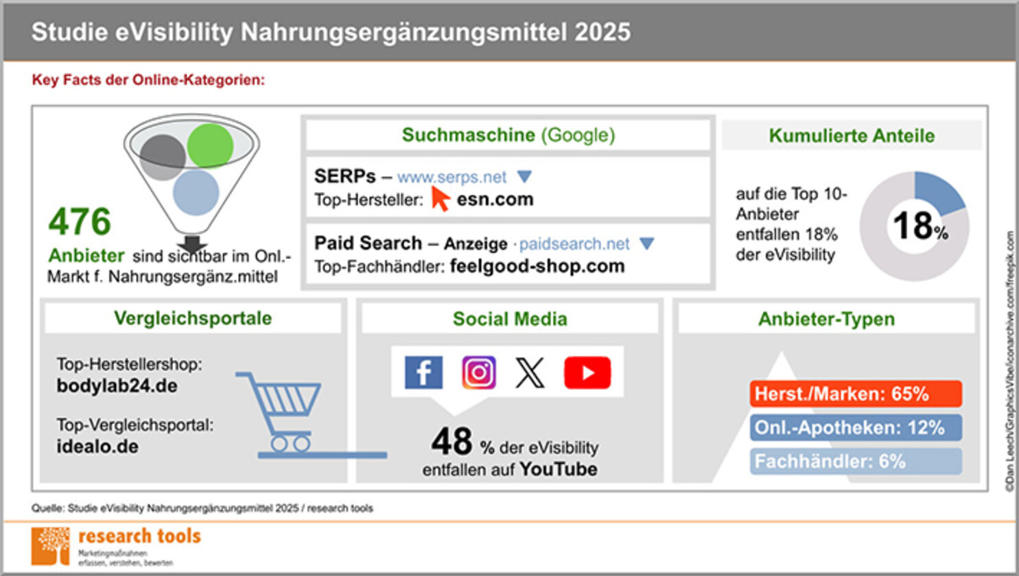 Die Studie „eVisibility Nahrungsergänzungsmittel 2025“ von research tools untersucht auf 85 Seiten die Präsenz der Top 100-Anbieter für Nahrungsergänzungsmittel in den fünf Onlinekategorien organische Suchmaschinenergebnisse, Paid Search, Vergleichsportale, Social Media und Plattform Amazon. Damit zeigt die Studie die Sichtbarkeit der Marktteilnehmer im Internet auf und gibt einen umfassenden Wettbewerbsüberblick. Ein Ranking eVisibility listet diese unter Berücksichtigung der Kategorie- und Gesamtpunktzahl. Insgesamt 476 Anbieter sind sortiert nach Rängen.