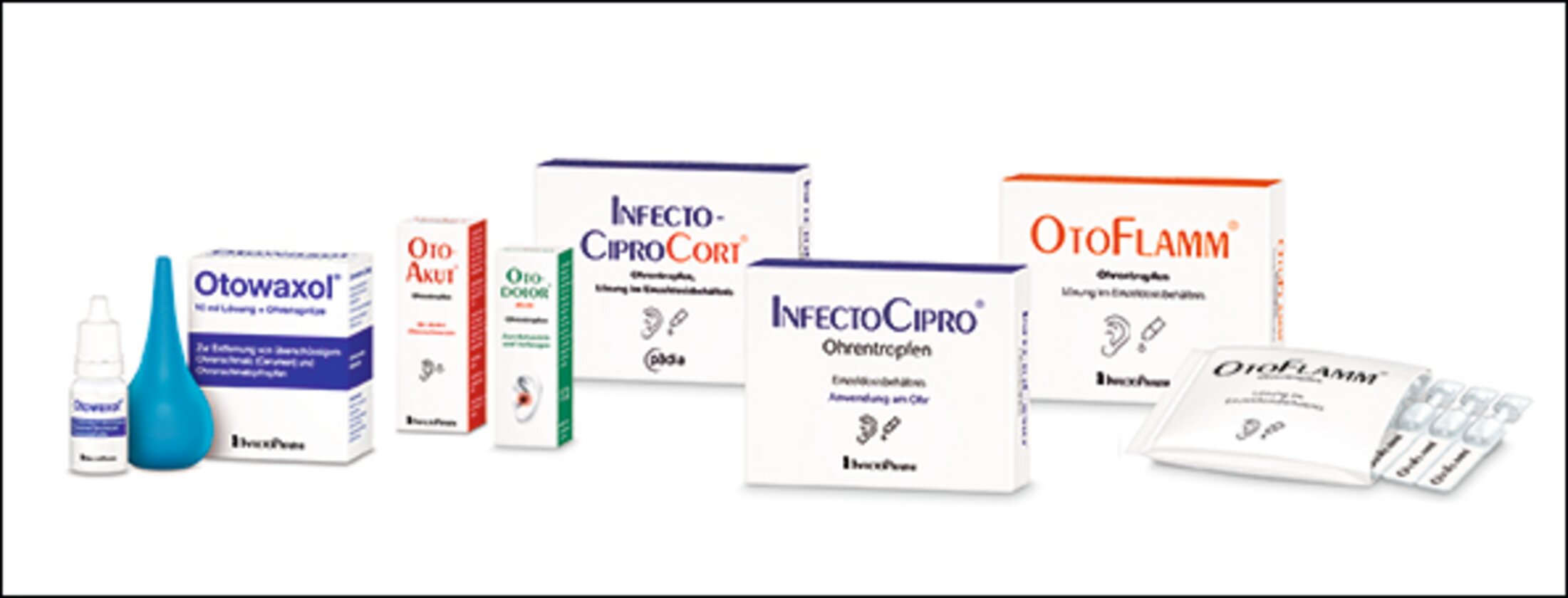 Eine verlässliche Basis bilden die bestehenden HNO-Präparate im verschreibungspflichtigen und verschreibungsfreien Bereich. Otodolor Ohrentopfen beispielsweise eignen sich zur Vorbeugung und Behandlung der Otitis externa, insbesondere der Badeotitis. Zur akuten lokalen Linderung von Ohrenschmerzen stehen OtoAkut Ohrentropfen mit den Wirkstoffen Phenazon und Procain zur Verfügung. Als ein reines Kortison-Monopräparat zur Behandlung von trockenen Gehörgangsekzemen können OtoFlamm Ohrentropfen verschrieben werden. Ergänzt wird das Portfolio zudem durch antibiotische Ohrentropfen als Monotherapie (InfectoCipro) oder als Kombination mit entzündungshemmenden Kortikosteroiden (InfectoCiproCort) zur Behandlung von bakteriellen Infektionen des äußeren Gehörgangs. Otowaxol zur Ohrenpflege rundet das Angebot ab und ist bereits in nahezu allen Apotheken erhältlich.