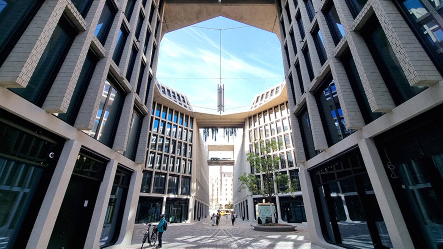 Pfizer bietet ein hybrides Arbeitsmodell an, das den Mitarbeitenden die Arbeit flexibel im Büro oder aus dem Home-Office ermöglicht. Aus diesem Grund wird im neuen Headquarter ein sogenanntes Desk-Sharing-Modell eingeführt: Mitarbeitende können täglich einen neuen Arbeitsplatz wählen, wodurch der vorhandene Platz bestmöglich genutzt und Raum für interaktive, kreative Zusammenarbeit geschaffen wird. Dafür wurden alle Arbeitsplätze mit höhenverstellbaren Schreibtischen ausgestattet. „Unsere neue Deutschlandzentrale ist ein Ort des Zusammenkommens und der Begegnung,“ sagt Inga Hartleb, Personalchefin bei Pfizer in Deutschland. „Die räumliche Gestaltung, die digitalen Möglichkeiten und die vielfältige Nachbarschaft schaffen attraktive Arbeitsbedingungen. Unsere Mitarbeitenden werden in einem intelligent gestalteten Gebäude arbeiten und Teil einer Gemeinschaft sein, die eine Atmosphäre schafft, in der jede:r Einzelne sein volles Potenzial entfalten kann.“