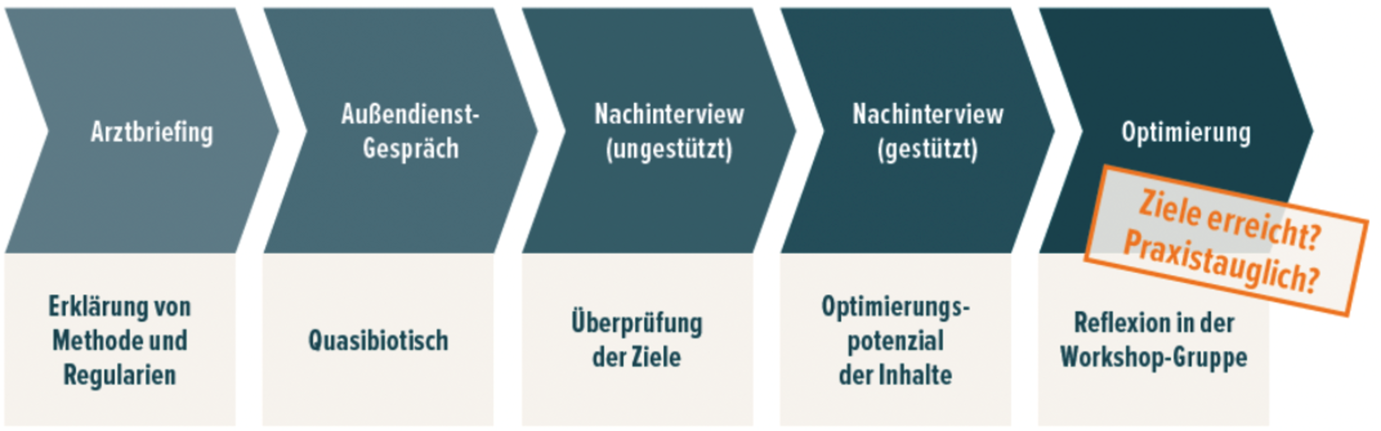 Der Ablauf eines Gesprächslabors (siehe Abbildung oben) gliedert sich in fünf grundlegende Prozessschritte. Zunächst erfolgt eine Aufklärung des Arztes durch den Marktforscher bzw. Moderator über die Methode und wichtige Regularien wie Anonymitätsverpflichtung, Pharmakodex und Pharmakovigilanz. Anschließend erfolgt das typische Außendienstgespräch mit den entsprechenden Gesprächsunterlagen, das in der Regel von einem echten Außendienstmitarbeiter durchgeführt wird. Danach führt der Moderator/Marktforscher die ungestützten und gestützten Nachinterviews durch. Hier wird überprüft, ob die Kommunikations- und Verhaltensziele erreicht wurden, ob die Inhalte verstanden wurden oder ob es noch Optimierungspotenzial hinsichtlich der Inhalte und des Gesprächsflows gibt. Im abschließenden Workshop mit dem Kunden werden Optimierungsmaßnahmen diskutiert, umgesetzt und strategische Ableitungen aus allen Insights entwickelt.