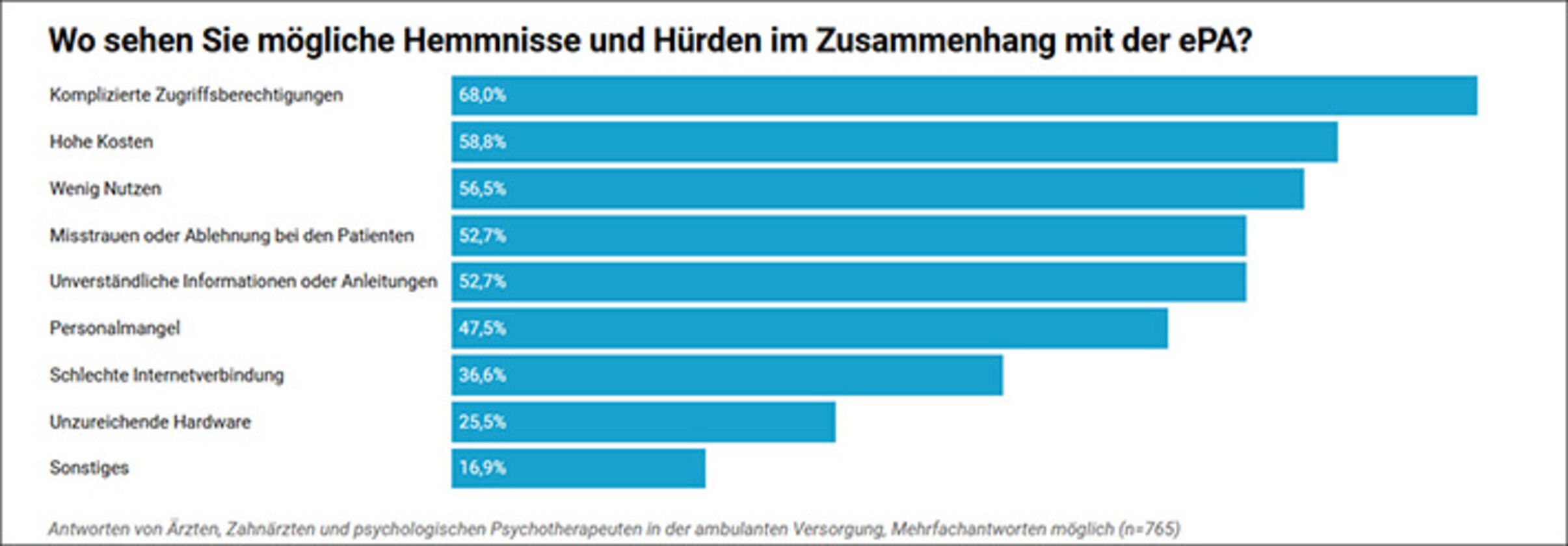 Bei der Frage nach möglichen Hemmnissen und Hürden belegen komplizierte Zugriffsberechtigungen klar den ersten Platz (68,0 Prozent). Auf Rang 2 folgt das Argument der hohen Kosten (58,8 Prozent). Auf dem dritten Platz rangiert die Einschätzung, dass die ePA wenig Nutzen bringe. Genannt wurden in den Freitexten vor allem praktisch-organisatorische Gründe sowie die Tatsache, dass Patienten über die Inhalte entscheiden.