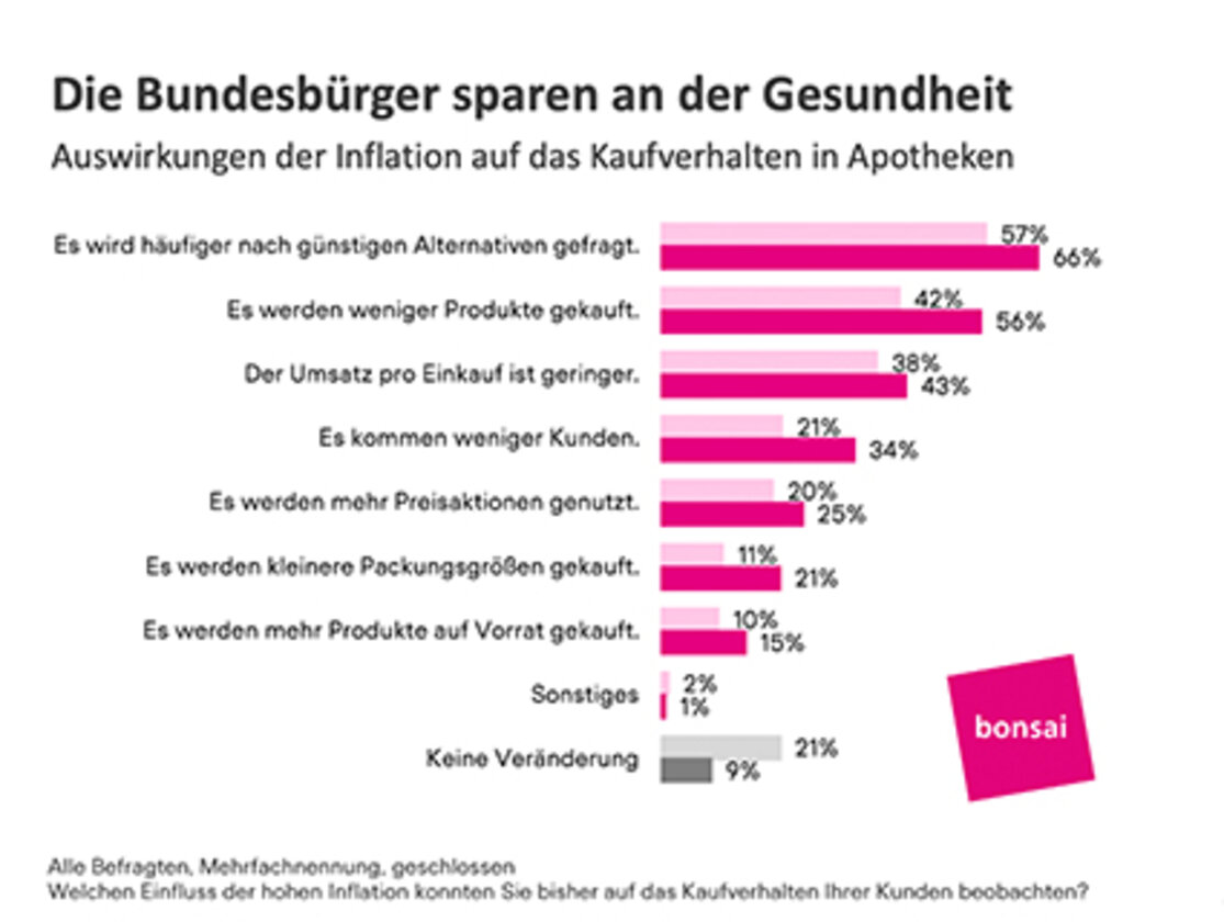 Neun von zehn ApothekerInnen (91 Prozent) sagen, dass ihre Kundschaft angesichts der Inflation das Kaufverhalten geändert hat. Im Jahr zuvor stellten nur 79 Prozent diesen Negativtrend fest. Weitere Ergebnisse der 2023er Bonsai OTC-Vertriebsstudie bestätigen, dass die Bürger beim Thema Gesundheit sparen: „Den Apotheken vor Ort brechen die Kunden und die Umsätze weg,” stellt Bettina Mertens-Danowski, Head of Bonsai Health, fest. Mehr als ein Drittel der Apotheken (34 Prozent) verzeichnet einen Rückgang bei der Anzahl der Kunden. Im Vorjahr war es „nur” rund ein Fünftel gewesen (21 Prozent). Und mehr als die Hälfte (56 Prozent) sagt, dass die Kunden darüber hinaus weniger Produkte pro Apothekenbesuch kaufen (Vorjahr: 42 Prozent).