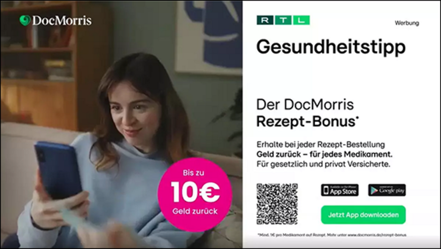 Der RTL Partnertipp verbindet die Strahlkraft des RTL-Designs (u. a. Red Dot Award 2022 „Best Media Brand“, German Brand Award 2022) mit einer Empfehlung, die durch die starke Markenwahrnehmung von RTL für die Zielgruppe wertvoll ist. Im aktuellen „RTL Gesundheitstipp“ steht der DocMorris Rezept-Bonus im Fokus. Mit ihm erhalten Kund:innen bis zu 10 Euro pro Medikament Rückerstattung. Einfach den integrierten QR-Code scannen, direkt in der DocMorris-App einlösen und Geld zurückbekommen.