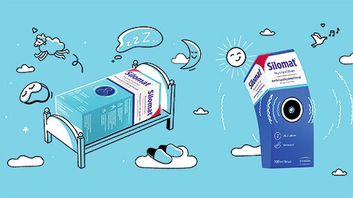 Die Kampagne hebt sich durch ihren illustrativen und humorvollen Look deutlich von der branchenüblichen Testimonial-Kommunikation ab. Im Mittelpunkt steht die neue Verpackung als Hero: Mal als Krankenwagen, mal im Bett liegend oder als tanzende Lautsprecherbox. So können wir die Verpackung immer wieder neu erfinden und Geschichten erzählen. Mit unserem Claim „Und der Husten erlebt sein blaues Wunder” unterstreichen wir die humorvolle Kampagne und betonen die Wirkstärke von Silomat®.