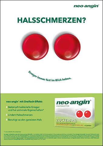 Unsere Strategie führt intelligent einen Faktor ins Feld, der hier schnell „wirkt“: die Ikonizität der Marke neo-angin. Seit Jahrzehnten sind nämlich die beiden roten Lutschtabletten, die uns auf der Packung anblicken, das visuelle Synonym und Brand-Signal für neo-angin schlechthin. Diesen ikonischen roten Tabletten haben wir daher eine neue und zentrale Rolle in der HCP- und Patienten-Kommunikation gegeben. Sie symbolisieren große, offene Augen, welche die Krankheitserreger bei Halsschmerzen fest in den Blick nehmen und damit zum zentralen Vorteil von neo-angin in der Halsschmerztherapie plakativ hinführen: Dass neo-angin sowohl antibakteriell wirkt, als auch antivirale Eigenschaften hat und somit in diesen Punkten anderen Präparaten vorzuziehen ist. HCPs und Patienten, bei denen sich die Kampagne verankert hat, werden die Sichtwahl der Halsschmerzpräparate buchstäblich mit anderen Augen, bzw. mit den Augen von neo-angin classic sehen! Und damit neo-angin stärker empfehlen bzw. direkt nachfragen.
