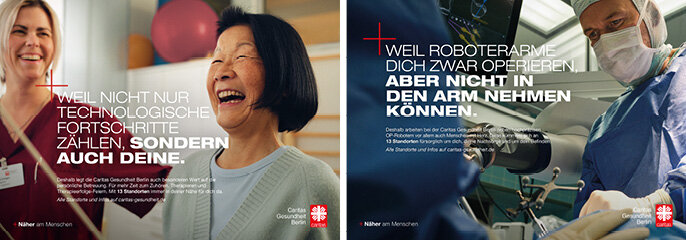 Die Marke Caritas Gesundheit Berlin wurde dafür komplett neu positioniert. Seite an Seite mit den Pfleger:innen, Ärzt:innen und im OP entstand dafür zusammen mit den Fotograf:innen Sophie Schwarzenberger und Matthias Wehowsky ein emotionaler Bild-Pool ganz nah am Menschen – mit 150+ Motiven für alle Medien. Die Werte Nähe und Menschlichkeit spiegeln sich auch in der neuen visuellen Sprache wider – durch Tonalität auf Augenhöhe, gefühlvolle Headlines und eine zeitgemäße Gestaltung. Dabei reicht die Kommunikation von klassischer Außenwerbung im lokalen Umfeld in Berlin über Recruiting-Webseite und einer neuen Employer-Branding-Kampagne bis hin zu internen Kommunikationsmitteln wie das durch Parat komplett überarbeitete Magazin für Mitarbeitende.