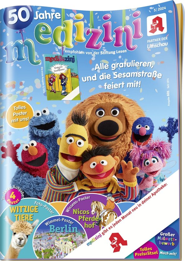 Sesame Workshop, die weltweit tätige Organisation hinter der Sesamstraße, stiftet den Hauptpreis des Gewinnspiels: einen Besuch am Hamburger Set der beliebten TV-Sendung. Das Wissensposter dieser Ausgabe zeigt unsere quirlige Hauptstadt Berlin, auf der Rückseite können die Fans Nicos Pferdehof erstmals im Detail erkunden. Und natürlich gratulieren auch ganz besonders kuriose Tiere wie Brüllaffen, Dreifarbenreiher oder Schopfmakaken dem Kinderpostermagazin mit lustigen Sprüchen wie "50 Jahre? Dafür gibt's ein Ständchen mit meiner Luftgitarre!" vom Grauen Riesenkänguruh.