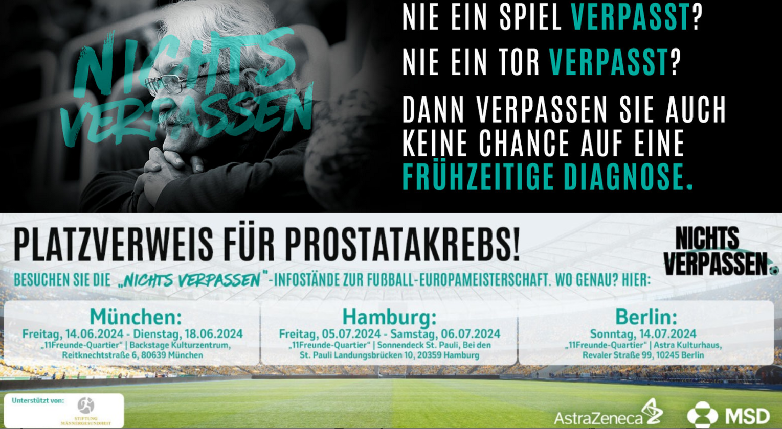 Informationen rund um die Prostatakrebsvorsorge gibt es in den EM-Quartieren der 11FREUNDE. Denn dort befinden sich die Infostände der „Nichts verpassen“-Kampagne, einer Aufklärungsinitiative von AstraZeneca und MSD Deutschland. Nach einem erfolgreichen Auftakt in München zieht die Roadshow für die Viertelfinale und das Finale weiter nach Hamburg und Berlin. Hier die Termine: