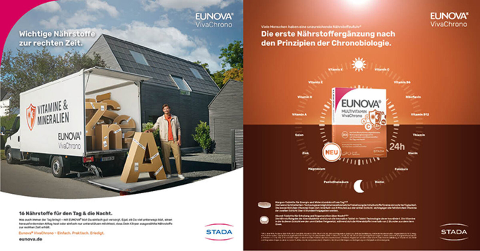 Mit dem Slogan „Wichtige Nährstoffe zur rechten Zeit.“ akzentuieren die Kreativen von Schmittgall Health die Bedeutung einer gezielten Nährstoffversorgung, die an den Biorhythmus des Körpers angepasst ist. Als sympathischer Protagonist der Kampagne agiert ein Paketzusteller, der die 16 essenziellen Nährstoffe von "Eunova VivaChrono" genau dann ausliefert, wenn der Körper sie besonders gut aufnehmen kann.