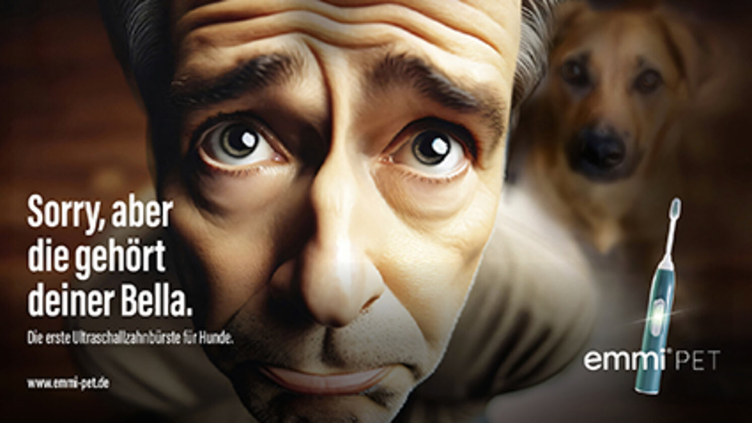 Den Kern der Kampagne bilden Motive, die Frauchen oder Herrchen zeigen, wie sie sich mit einem herzerweichenden Hundeblick eine „emmi PET“-Zahnbürste erbetteln wollen. Das Besondere an diesen Motiven: sie wurden mit Hilfe von KI entwickelt.