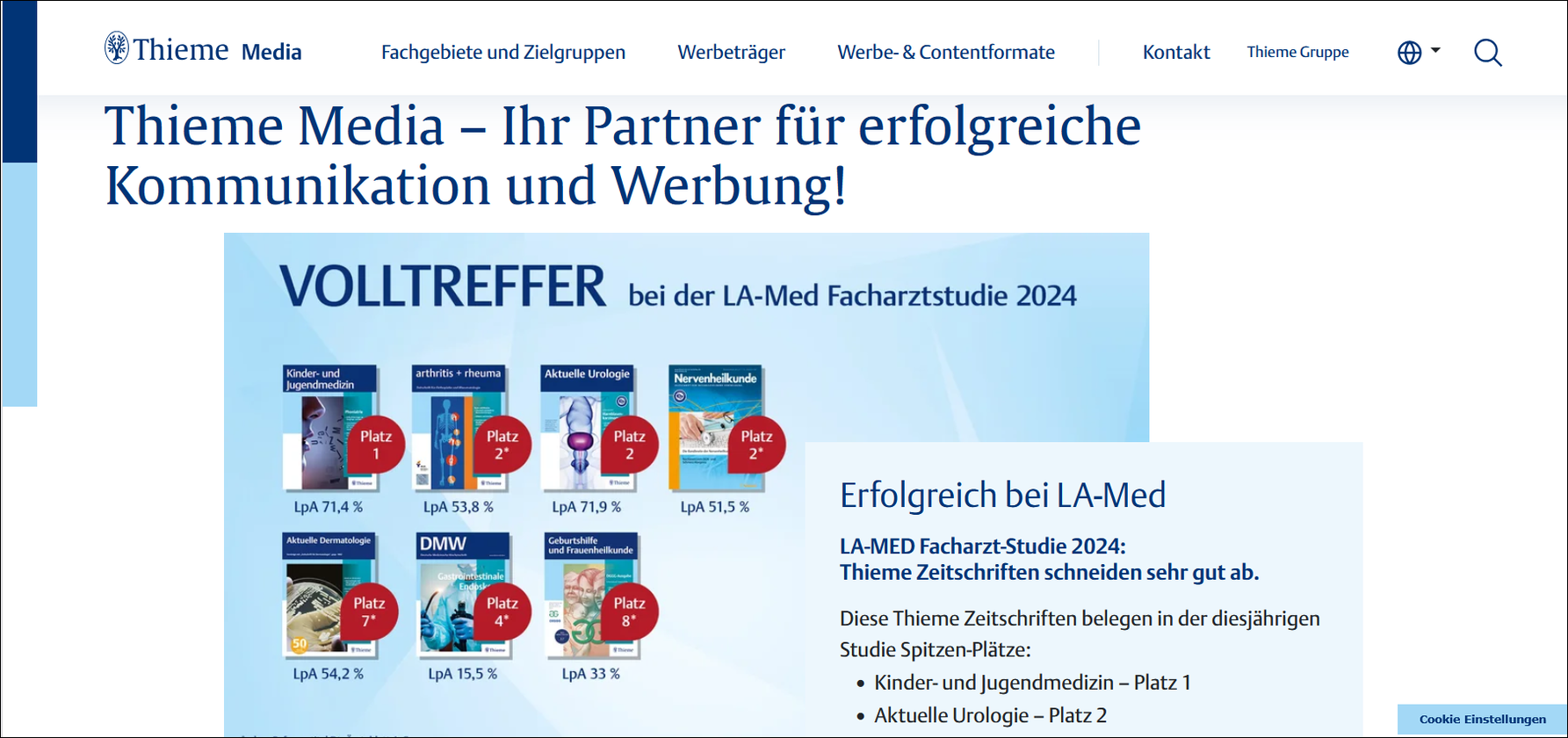 Thieme Media unterstützt Businesskunden in der wissenschaftlichen Kommunikation mit Healthcare Professionals und Entscheidern aus Klinik und Praxis. Grundlage hierfür sind das breite analoge und digitale Medien- und Produktportfolio von Thieme sowie neue moderne Online-Formate. Daraus werden maßgeschneiderte Kommunikationskonzepte für Kunden aus Medizintechnik, Gesundheitswirtschaft und der pharmazeutischen Industrie entwickelt und umgesetzt. Weitere Informationen gibt es unter www.thieme-media.de.