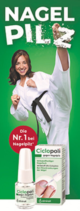 Aufgabenstellung war es, eine Kreativ-Kampagne zu entwickeln, die den Produktvorteil von Ciclopoli „Stark gegen Nagelpilz“ auf überraschende und aufmerksamkeitsstarke Art und Weise übersetzt. Die Idee von Whitecross: Eine Teakwondo-Kämpferin entdeckt beim Warm-up Nagelpilz an ihrem Zehennagel und tritt den eingeblendeten Schriftzug „Nagelpilz“ nach kurzem Zögern mit einem gekonnten Kick einfach weg!