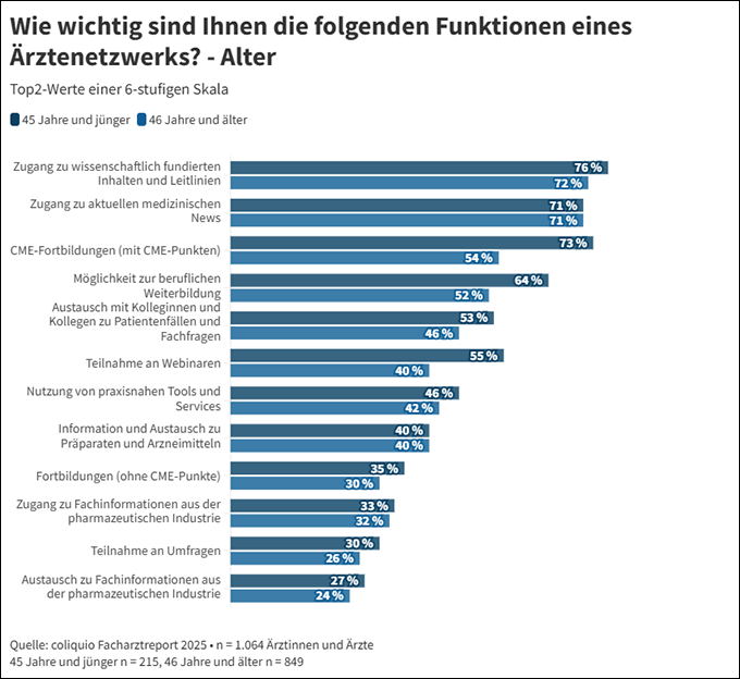 79 % der Befragten nutzen coliquio aktiv zur Weiterbildung – sowohl in der Niederlassung als auch in der Klinik und im jüngeren Segment ist das Netzwerk für Fortbildungszwecke etabliert. Besonders geschätzt werden wissenschaftlich fundierte Inhalte und Leitlinien, aktuelle medizinische News und CME-Fortbildungen. Vor allem die jüngeren Medizinerinnen und Mediziner sehen in digitalen CME-Angeboten einen hohen Mehrwert (73 %), schätzen Ärztenetzwerke als berufliche Weiterbildungsmöglichkeit (64 %) und für Webinare (55 %). Der Report macht deutlich: Ärztenetzwerke bieten heute weit mehr als nur Community-Funktionen – sie sind zu einem integralen Bestandteil des professionellen Lernens in der Medizin geworden.