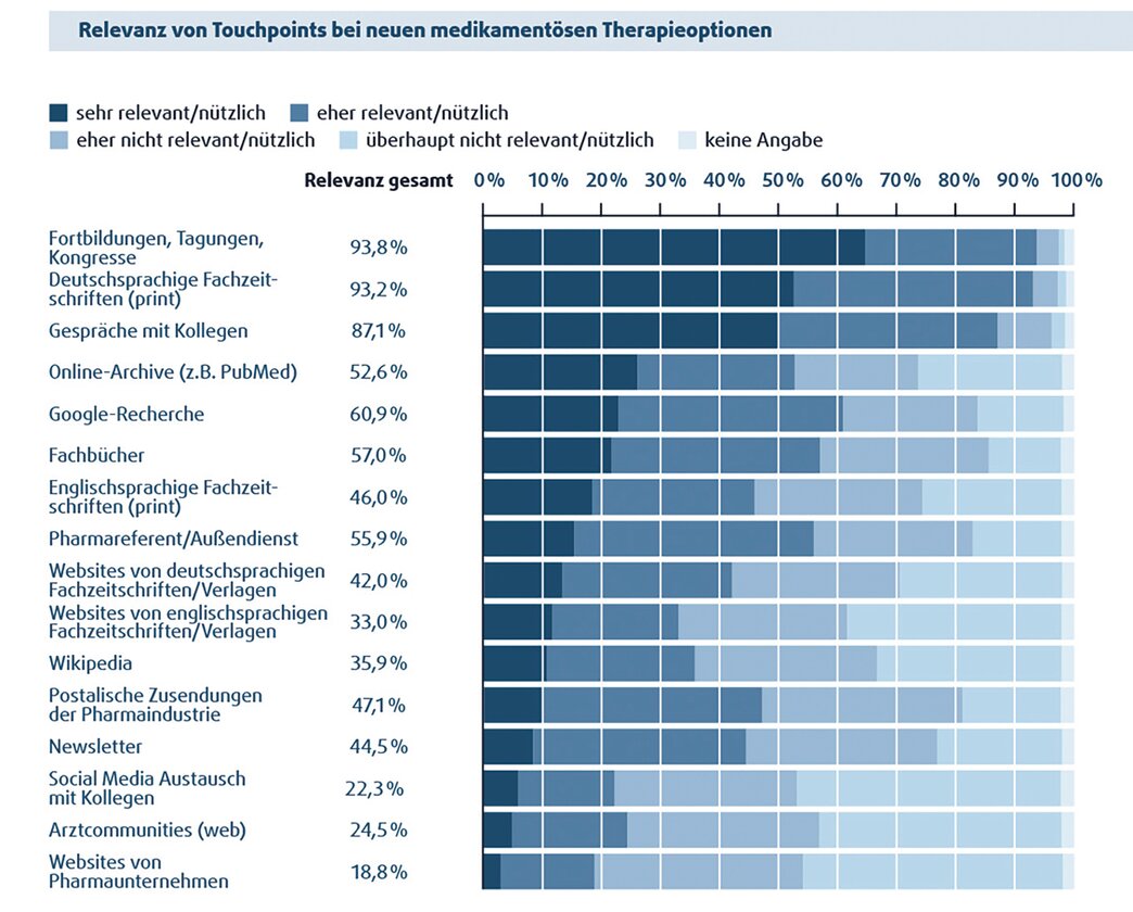 Im Touchpoint-Relevanz-Check werden die Medienangebote nach eigenen Angaben jetzt noch etwas detaillierter erhoben und deren Relevanz im Hinblick auf zwei unterschiedliche Situationen erfragt: Welche Touchpoints sind relevant, wenn es um Standardtherapien geht und welche sind es bei neuen Therapieoptionen? Hier werden in der Studie 2024 nun erstmals deutsch- und englischsprachige Fachzeitschriften (Print) und deren Websites differenziert untersucht. Die Top 3 der Touchpoints bleiben jedoch Tagungen/Kongresse, gefolgt von deutschsprachigen Fachzeitschriften (Print) und Kollegengesprächen.