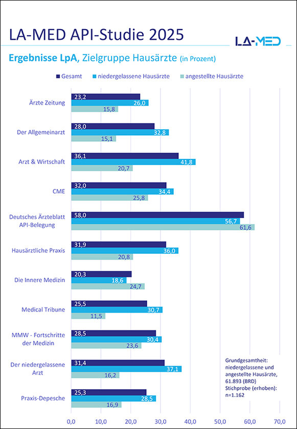 Dieser Fokus wurde mit der nun vorliegenden API-Studie 2025 um die angestellten Ärztinnen und Ärzte erweitert. „Neben dem früheren 'Normal', der Niederlassung, ist die angestellte ärztliche Tätigkeit im ambulanten Bereich inzwischen zu einer relevanten Größe geworden. Mit rund 16.900 angestellten Hausärzten ist dies eine Zielgruppe, die jetzt neu befragt wurde und die bisher nicht standardmäßig von allen Verlagen beliefert wird“, erläutert Stephan Kröck, LA-MED-Vorstand und Geschäftsführer der MedTriX-Group die neue Studienanlage. „Wir in der LA-MED haben diese Entwicklung seit mehreren Jahren beobachtet und gezielt mit marktforscherischen Projekten begleitet“, berichtet Jens Dessin, Springer Medizin und Leiter der LA-MED-Projektgruppe Studien und resümiert: „Die API-Studie 2025 ist nun die erste LA-MED-Reichweitenstudie, in der sowohl niedergelassene wie auch angestellte Ärzte im ambulanten Bereich zur Grundgesamtheit gehören.“