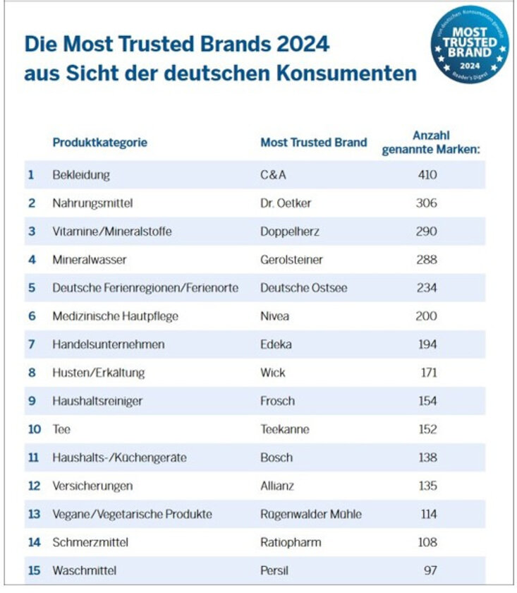 Die "Trusted Brand Studie" untersucht, welche Marken in Deutschland besonderes Vertrauen genießen. Im Auftrag von Reader's Digest befragte das Institut Dialego, Aachen, im Januar 2024 online 4.000 Personen in Deutschland, bevölkerungsrepräsentativ quotiert ab 18 Jahren. Reader's Digest erhebt bereits seit 2001 jährlich das Markenvertrauen von Konsumenten in Deutschland und ist mit einer Auflage von rund 116.000 verkauften Exemplaren eines der meistverkauften Monatsmagazine in Deutschland. Die Zeitschrift erreicht mit jeder Ausgabe etwa 1,2 Millionen Leserinnen und Leser.