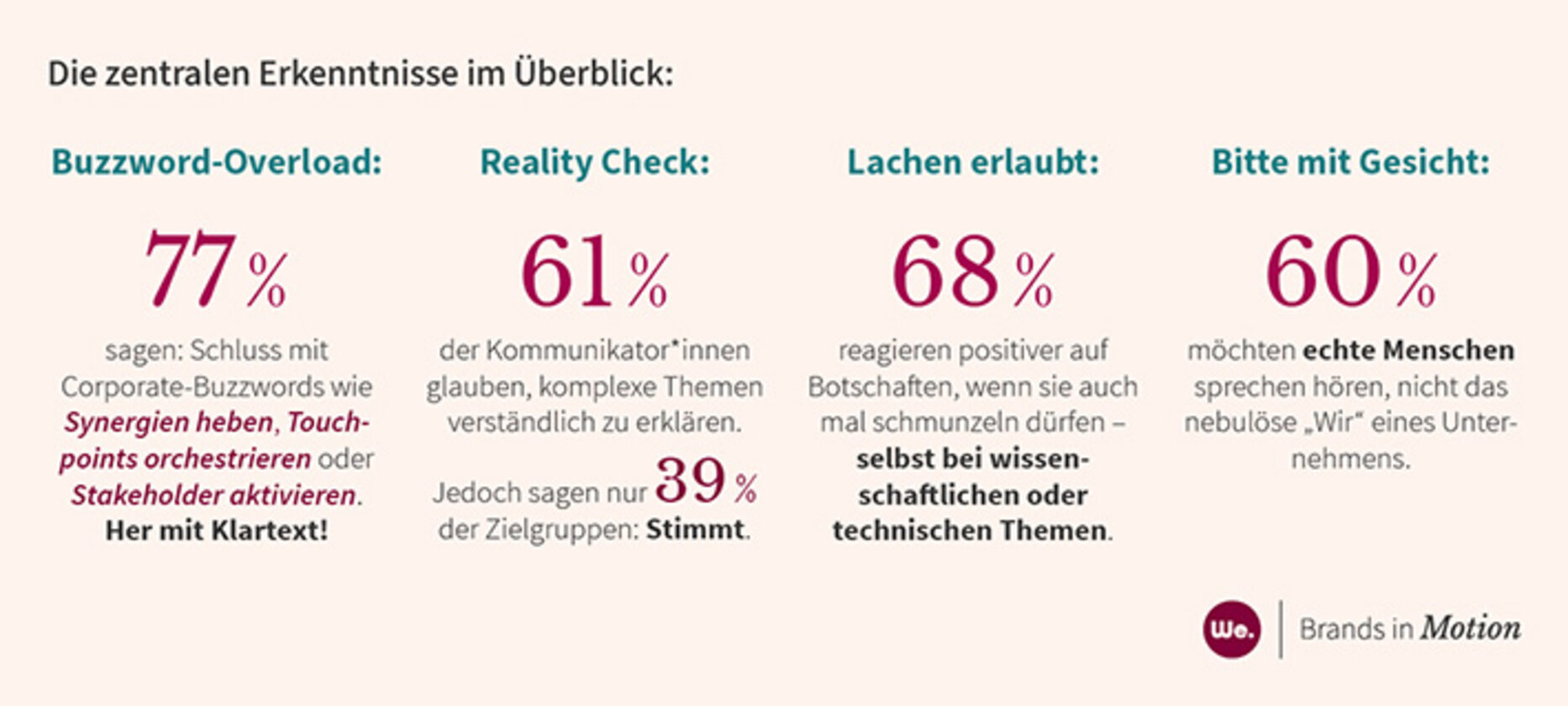 Die Erwartungen an Kommunikation sind klar, das ergab die globale Befragung mit mehr als 500 Teilnehmenden aus Deutschland. 77 % haben genug von Buzzwords und leeren Phrasen – sie wünschen sich echte, nahbare Sprache und eine klare Haltung.